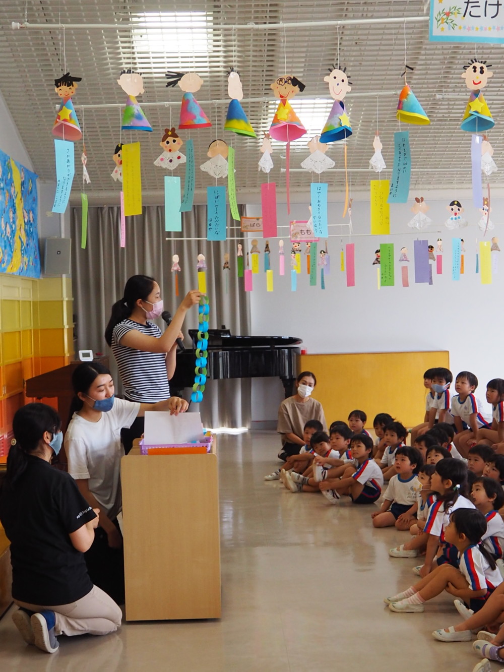 七夕のつどい 2020年07月07日 7月7日は七夕まつり 在園児は、自分の願い事を書いた可愛らしい短冊や色紙で作った提灯、吹き流し、網飾りを笹につけ、遊戯室に飾りました。 子どもたちは先生から、七夕のお話や、七夕飾りに込められた願いについて、一つ一つ教えてもらいました. 子どもたちのねがいが書かれた短冊 「七夕飾りには、ひとつひとつ願いが込められているんですよ」 また、子育て広場でも、地域の未就園の子どもたちと一緒に「七夕のつどい」を行いました。 小さなお友だちは、年長児の踊りを見ながら一緒にからだを動かしたり、七夕飾りを作ったり、ブラックシアターを見たりと、楽しく過ごしました。 ブラックシアター、とてもきれい!!