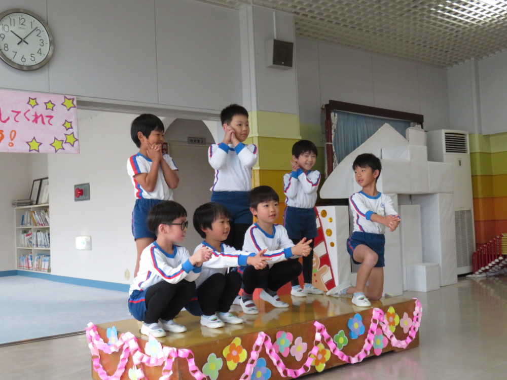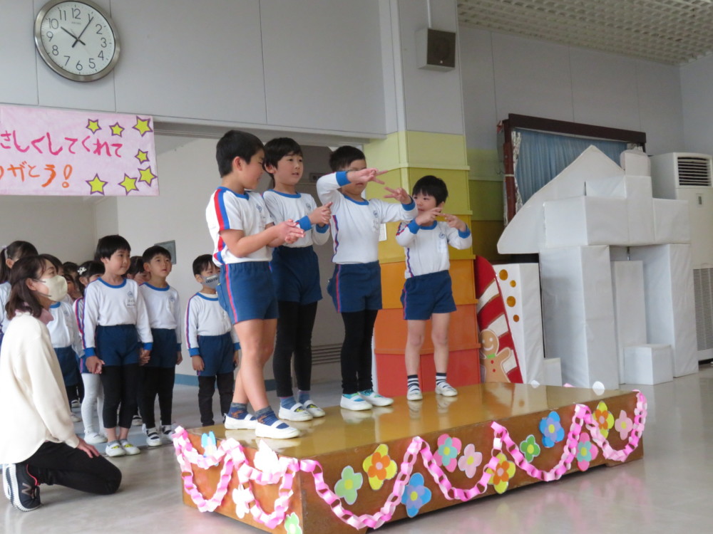 卒園児を送る会 2024年03月07日 3月7日に卒園児を送る会をしました。 卒園児がグループで考えたポーズをきめて登場すると、みんなから大きな拍手が起こりました。 園児みんなで楽しく踊ったり、豊田幼稚園クイズをして大盛り上がり。 卒園児は満3歳、年少、年中のお友達から手作りのプレゼントをもらいました。 今まで、やさしくしてくれてありがとう。