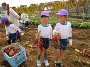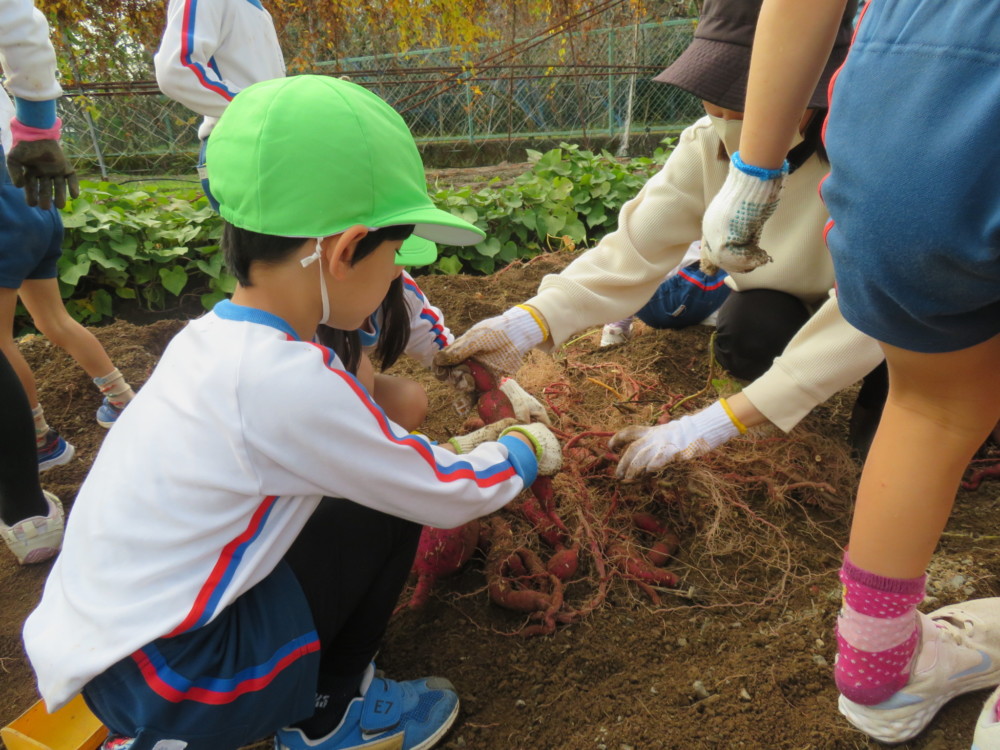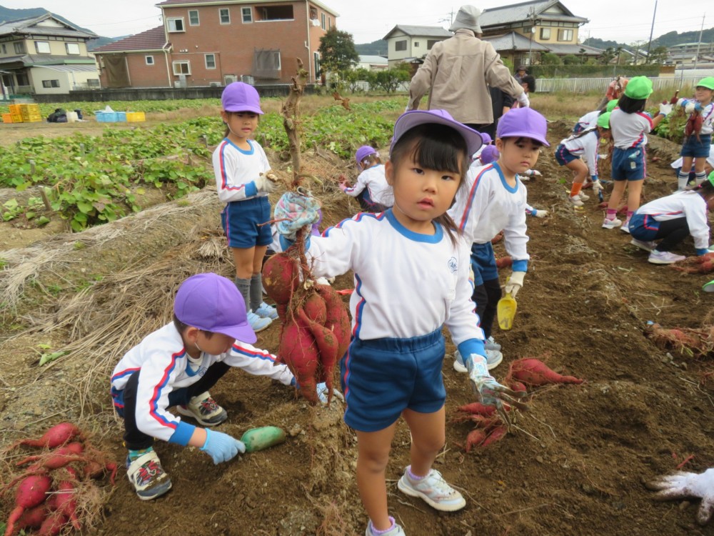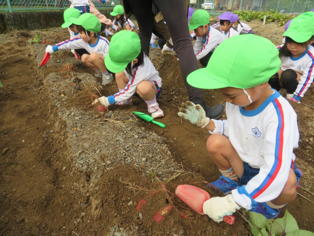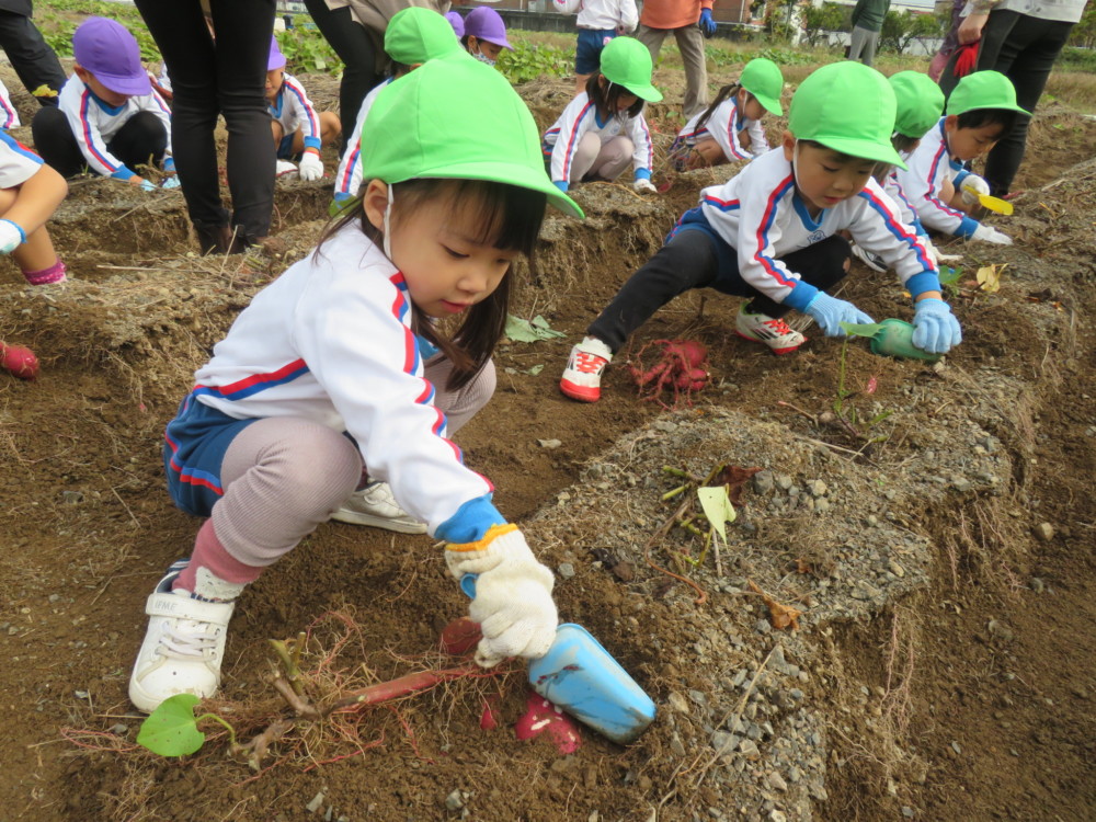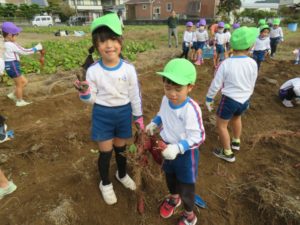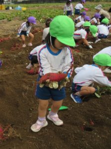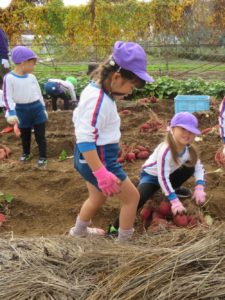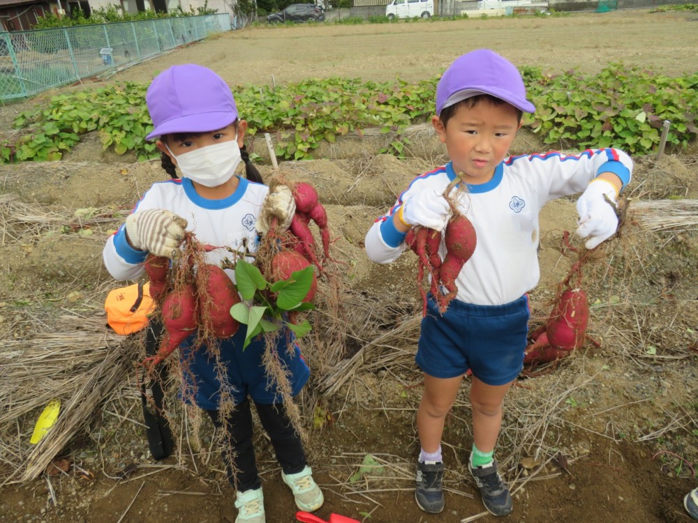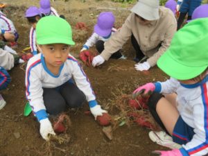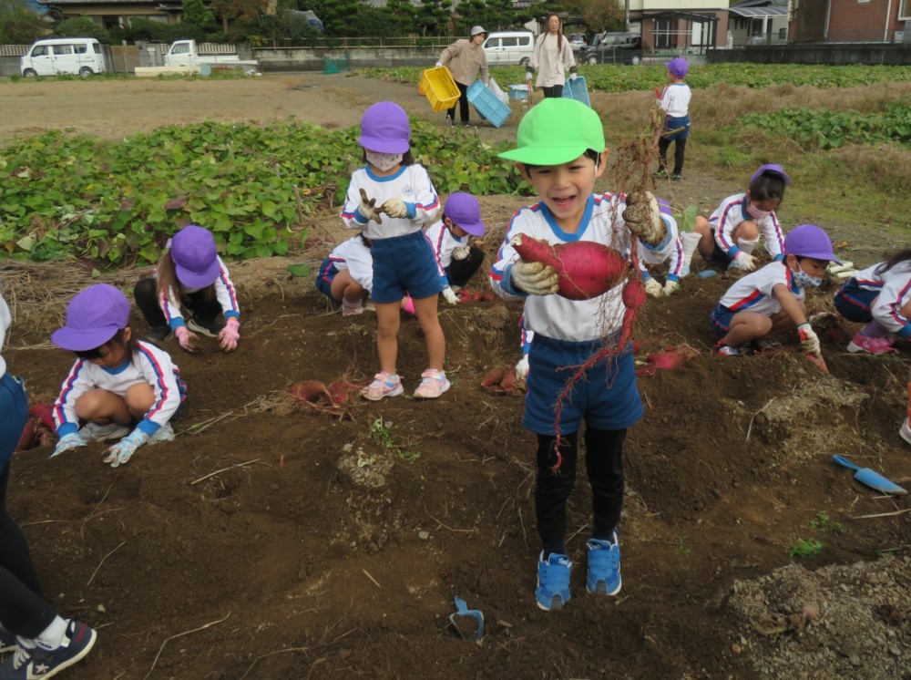 楽しかったさつまいも掘り 2025年11月11日 今日は年中児がさつまいも掘りを体験しました。 シャベルで土を掘ると大きなさつまいもがたくさん出てきて、子どもたちは歓声をあげながら、夢中で掘りました。 「大きいおいも! 見て見て」「楽しかった!」「わたし、いもほり名人だよ」と言う子どもたちの顔は、輝いていました。 大きなおいもは家におみやげに持ち帰りました。 明日は理事長先生がおいしい大学いもを作ってくれます。 来週は、みんなで焼きいもパーティー、楽しみです。