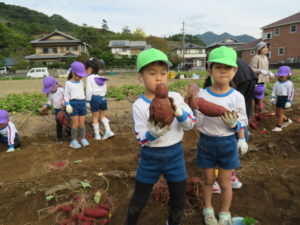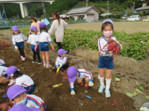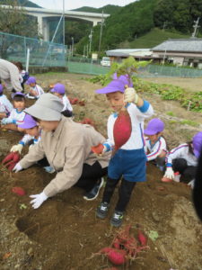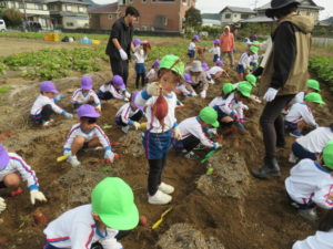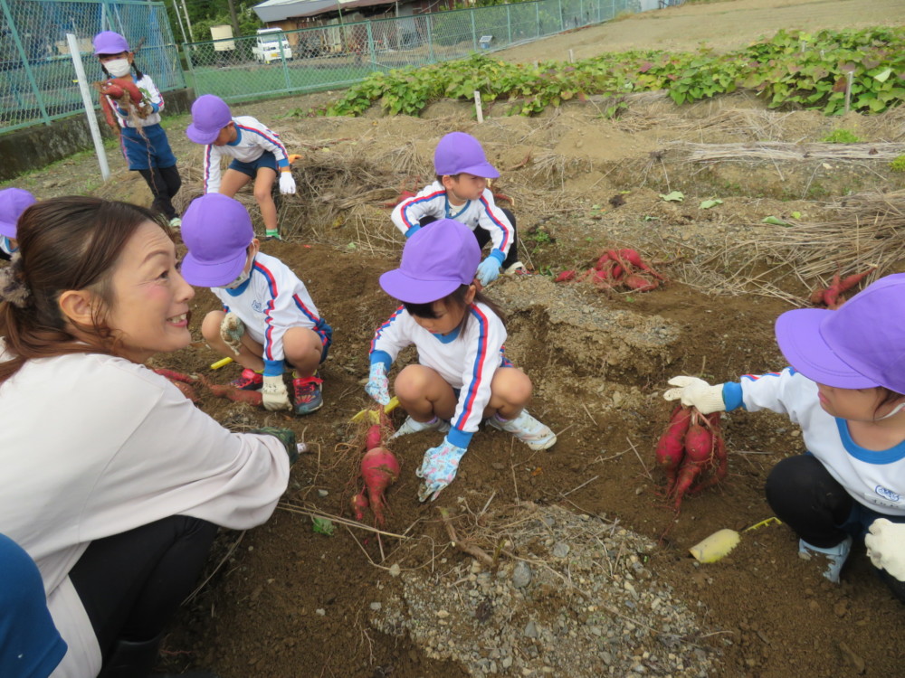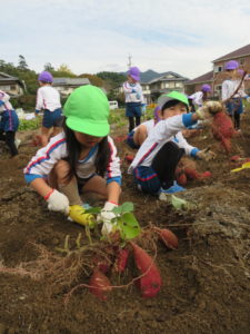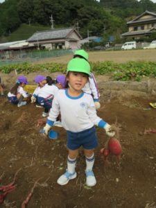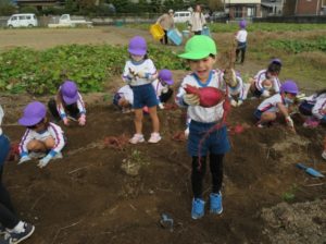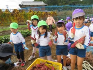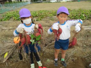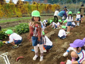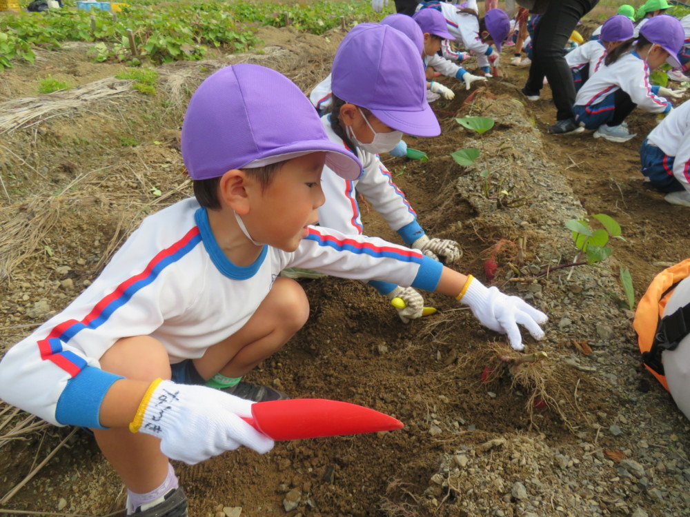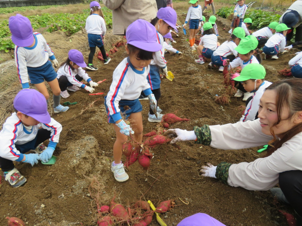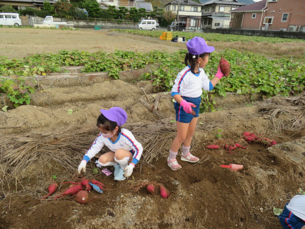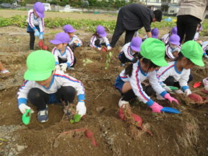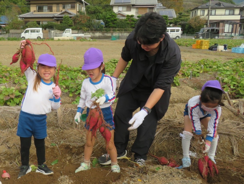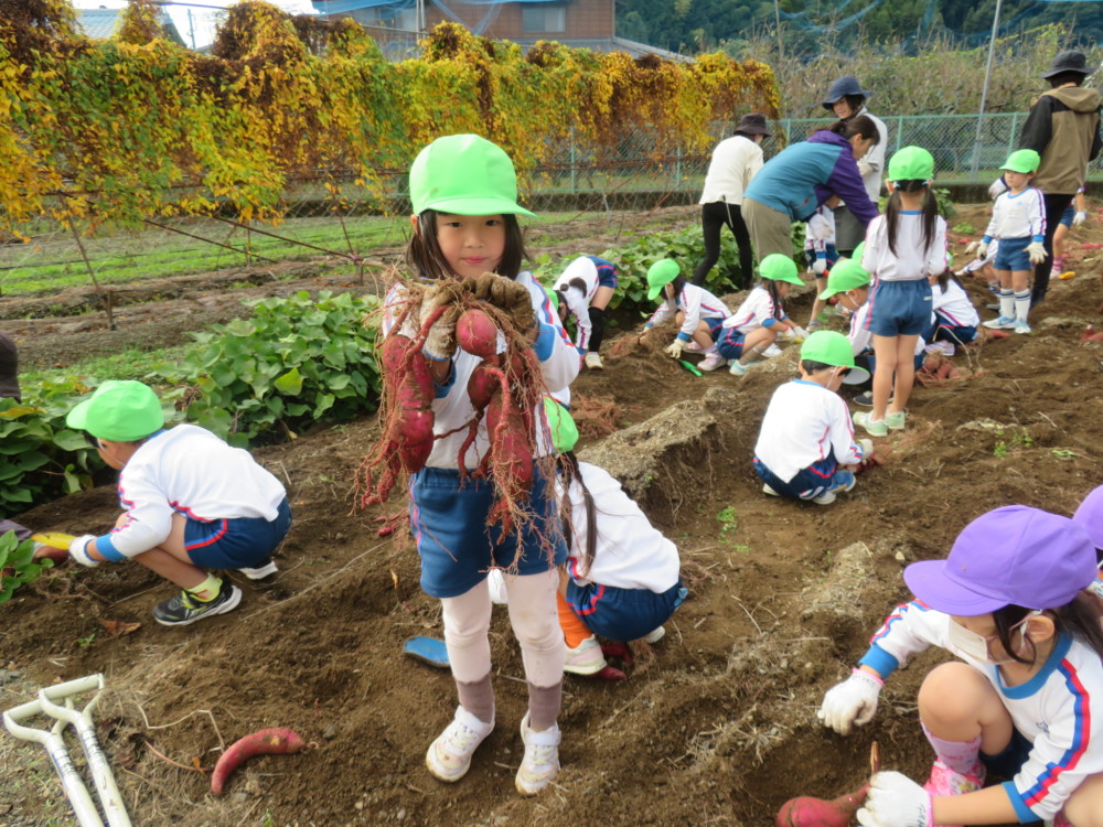 楽しかったさつまいも掘り 2025年11月11日 今日は年中児がさつまいも掘りを体験しました。 シャベルで土を掘ると大きなさつまいもがたくさん出てきて、子どもたちは歓声をあげながら、夢中で掘りました。 「大きいおいも! 見て見て」「楽しかった!」「わたし、いもほり名人だよ」と言う子どもたちの顔は、輝いていました。 大きなおいもは家におみやげに持ち帰りました。 明日は理事長先生がおいしい大学いもを作ってくれます。 来週は、みんなで焼きいもパーティー、楽しみです。