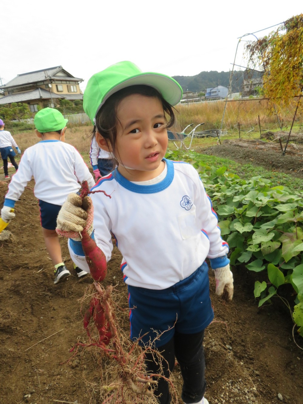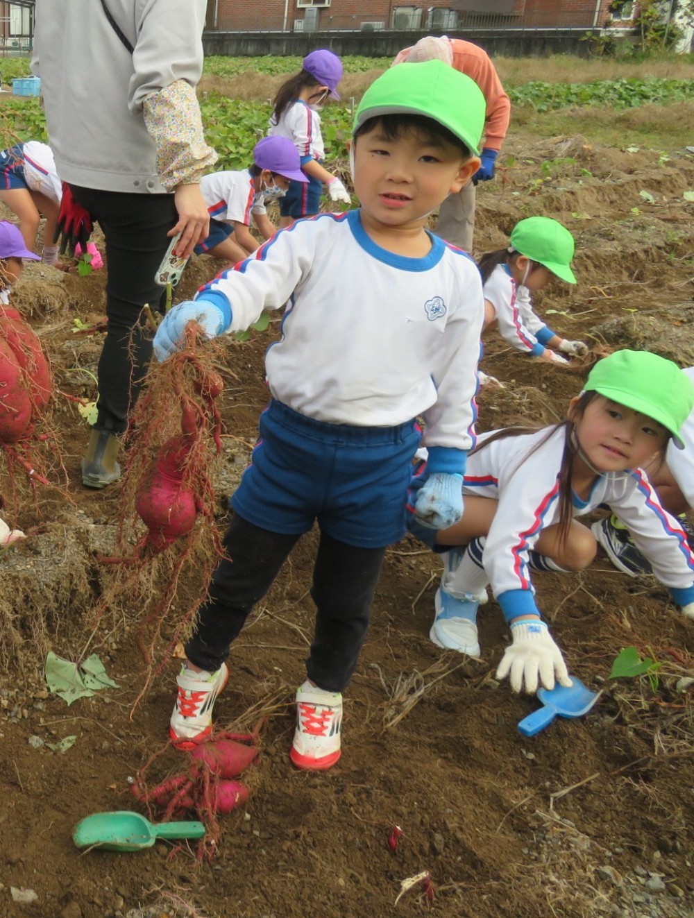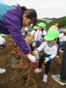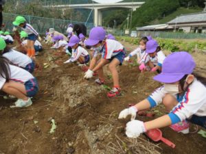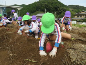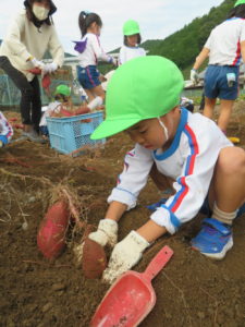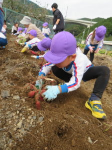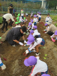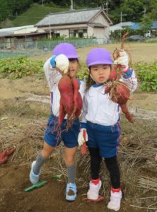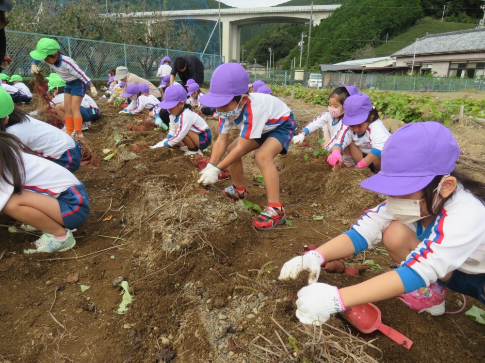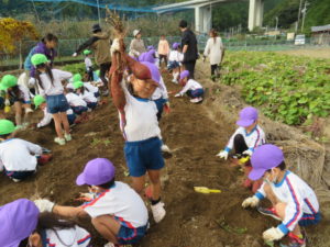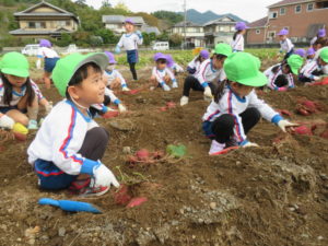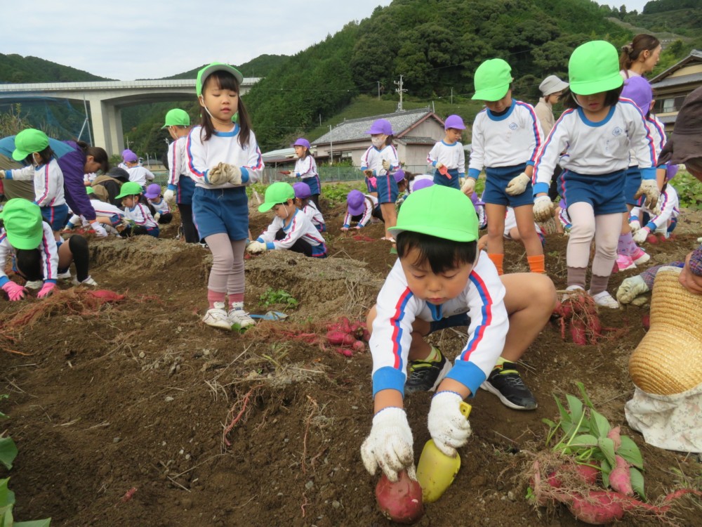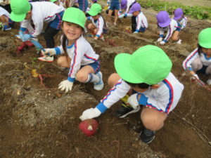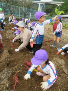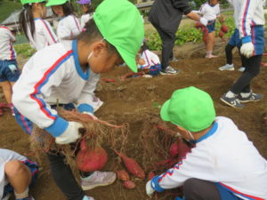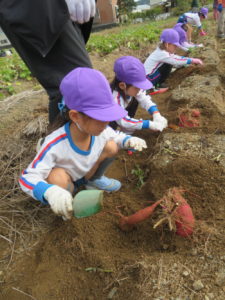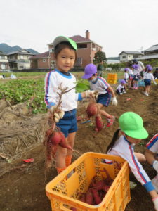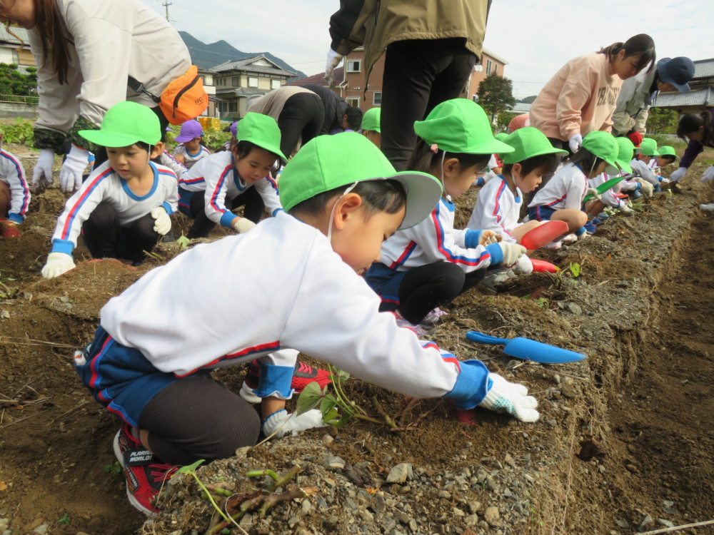 楽しかったさつまいも掘り 2025年11月11日 今日は年中児がさつまいも掘りを体験しました。 シャベルで土を掘ると大きなさつまいもがたくさん出てきて、子どもたちは歓声をあげながら、夢中で掘りました。 「大きいおいも! 見て見て」「楽しかった!」「わたし、いもほり名人だよ」と言う子どもたちの顔は、輝いていました。 大きなおいもは家におみやげに持ち帰りました。 明日は理事長先生がおいしい大学いもを作ってくれます。 来週は、みんなで焼きいもパーティー、楽しみです。