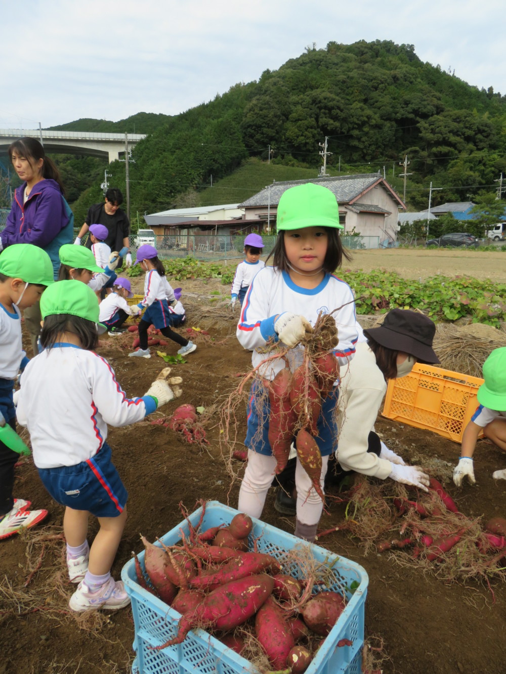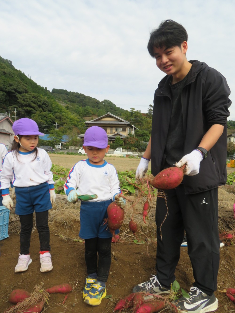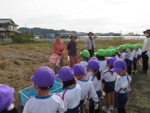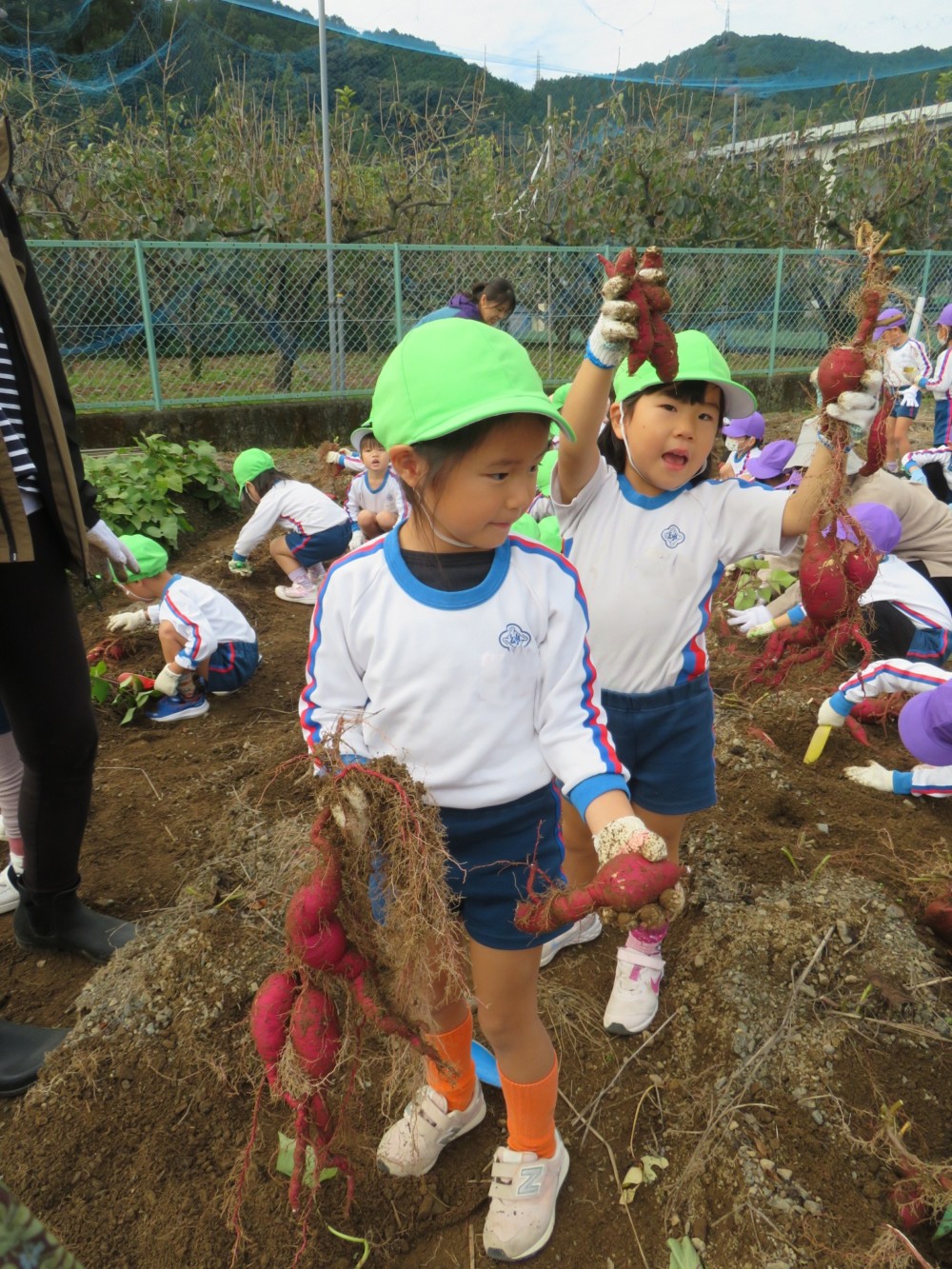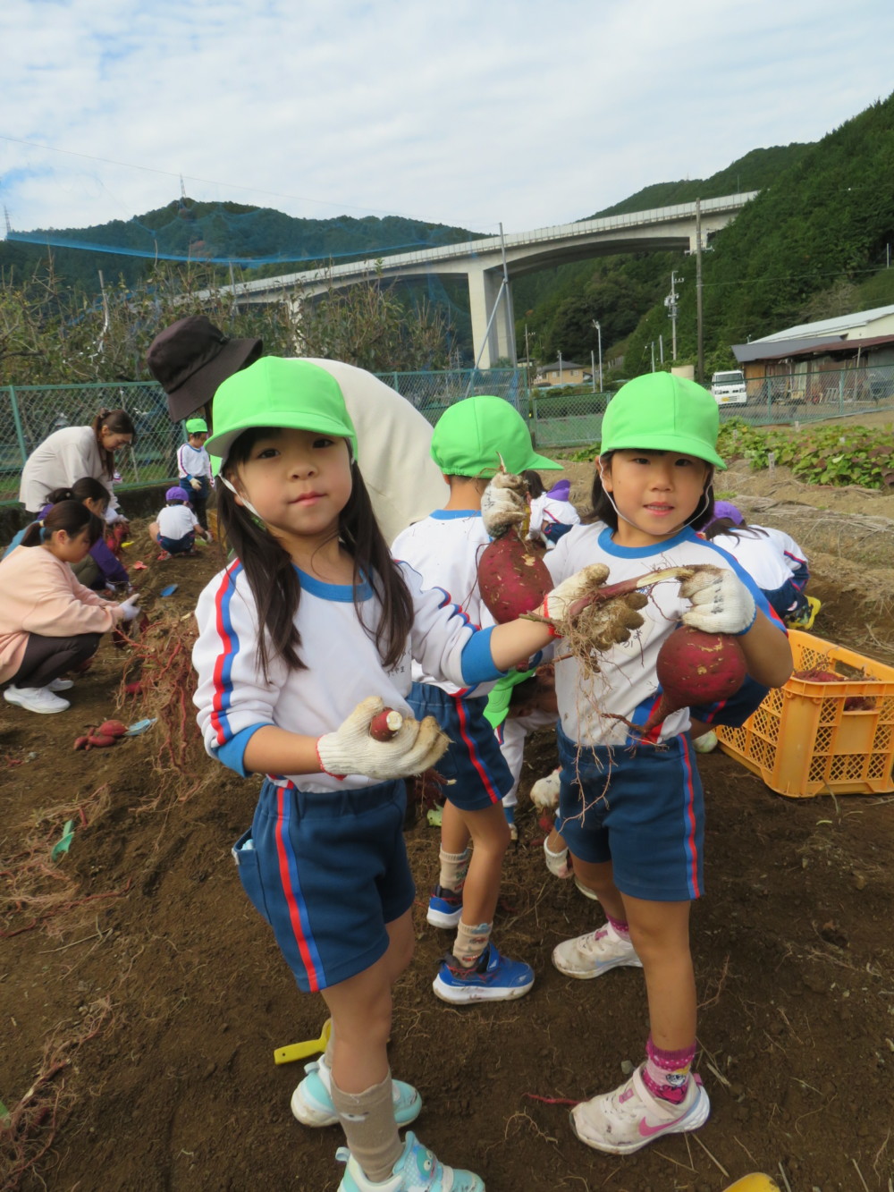 楽しかったさつまいも掘り 2025年11月11日 今日は年中児がさつまいも掘りを体験しました。 シャベルで土を掘ると大きなさつまいもがたくさん出てきて、子どもたちは歓声をあげながら、夢中で掘りました。 「大きいおいも! 見て見て」「楽しかった!」「わたし、いもほり名人だよ」と言う子どもたちの顔は、輝いていました。 大きなおいもは家におみやげに持ち帰りました。 明日は理事長先生がおいしい大学いもを作ってくれます。 来週は、みんなで焼きいもパーティー、楽しみです。