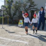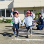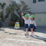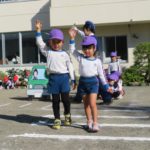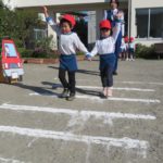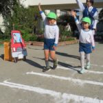 本園では毎日歩いて集団降園しているので、交通ルールについてはどの子も大変関心があり、園庭での信号の渡り方の練習も、張り切って参加していました。