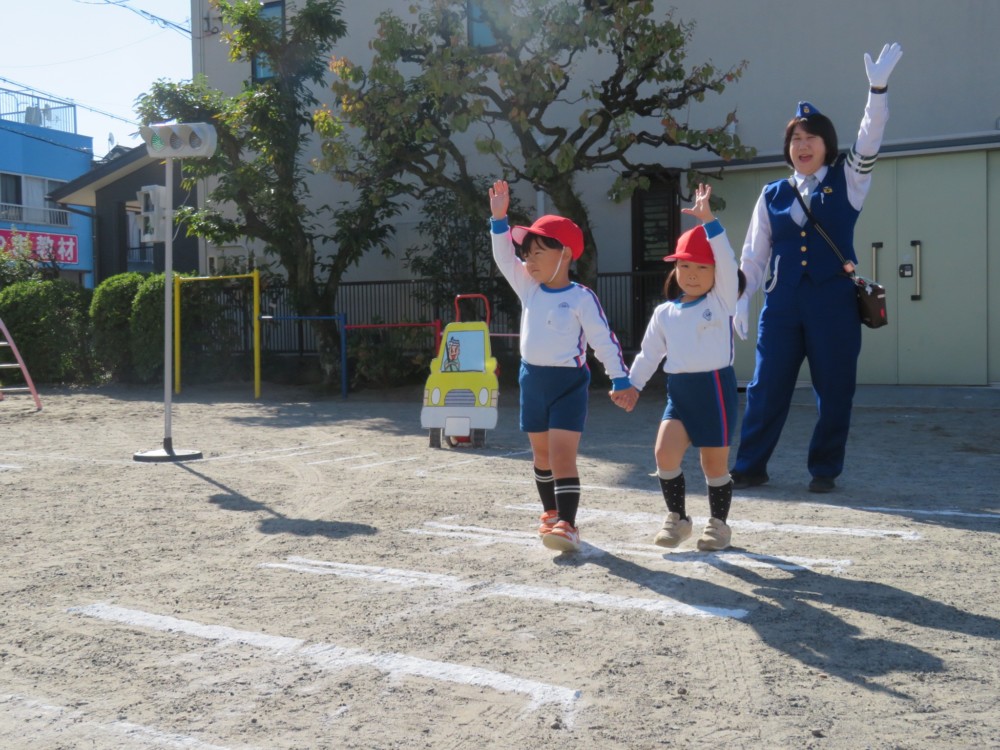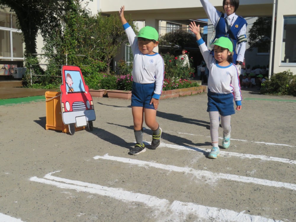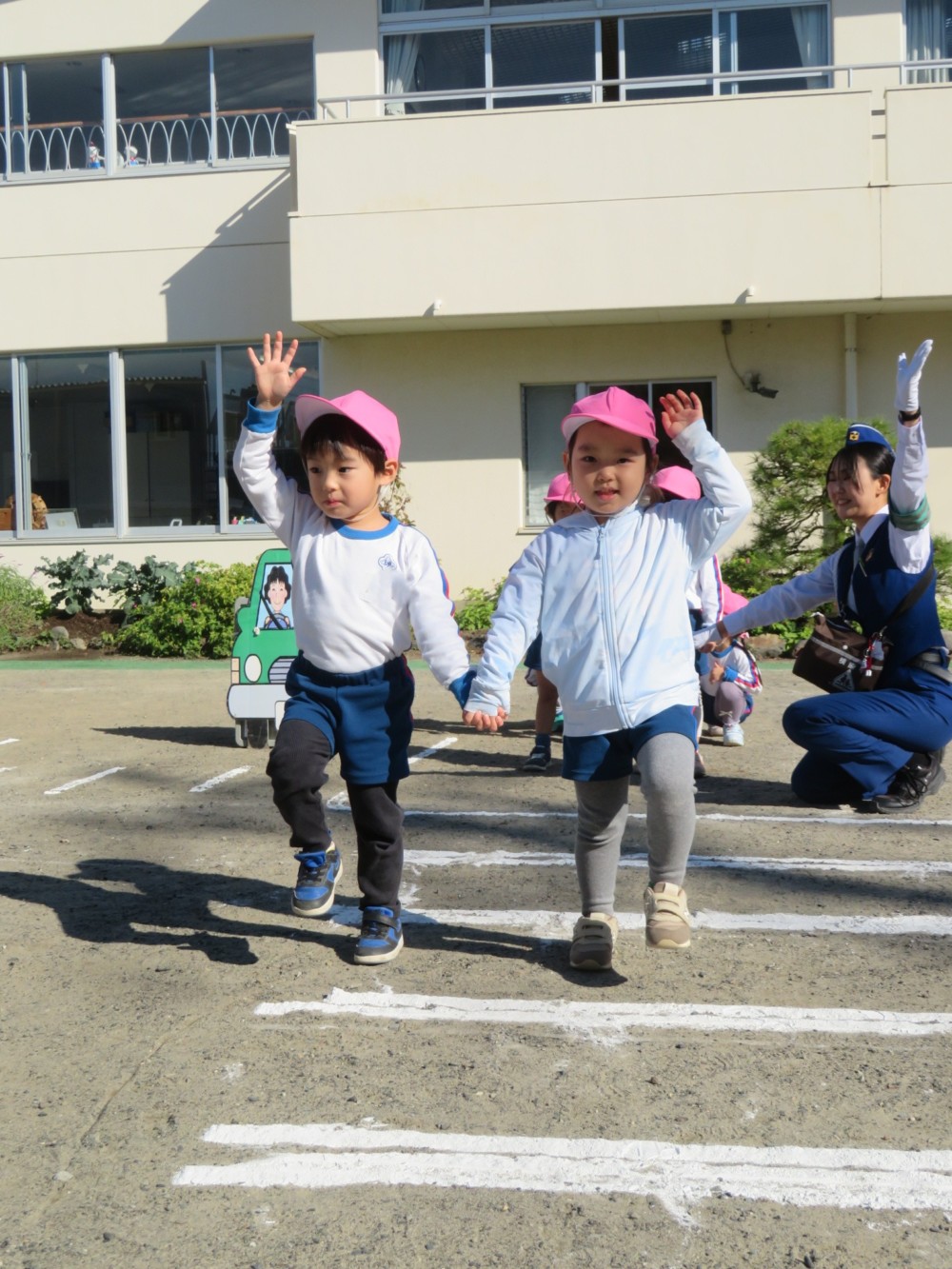 本園では毎日歩いて集団降園しているので、交通ルールについてはどの子も大変関心があり、園庭での信号の渡り方の練習も、張り切って参加していました。