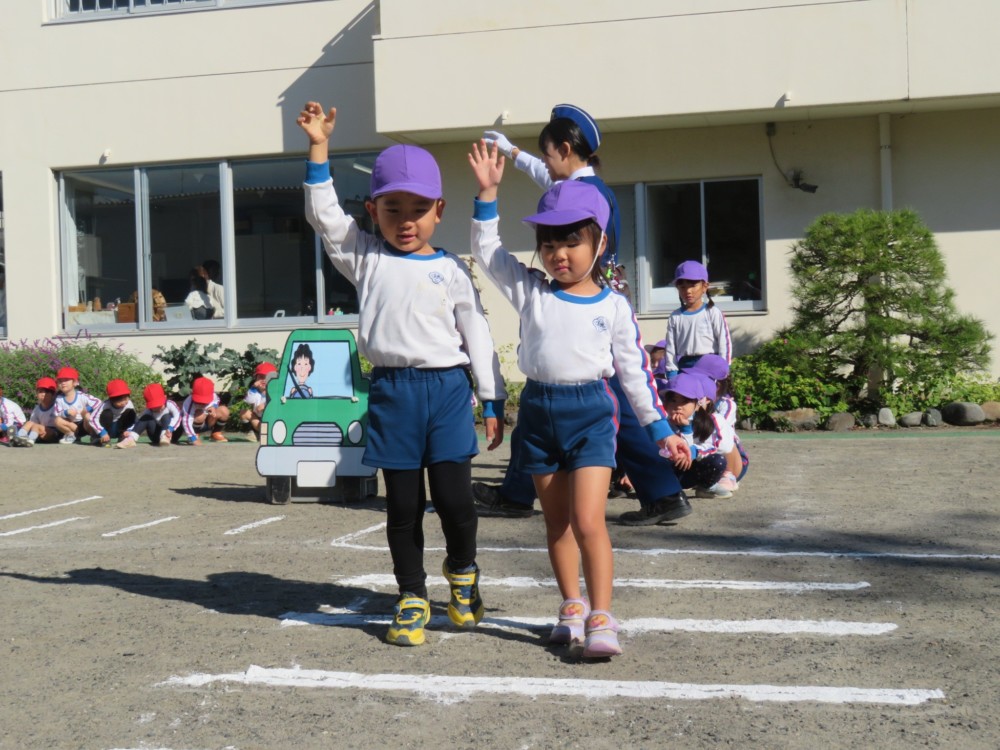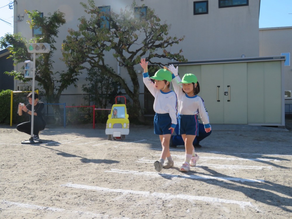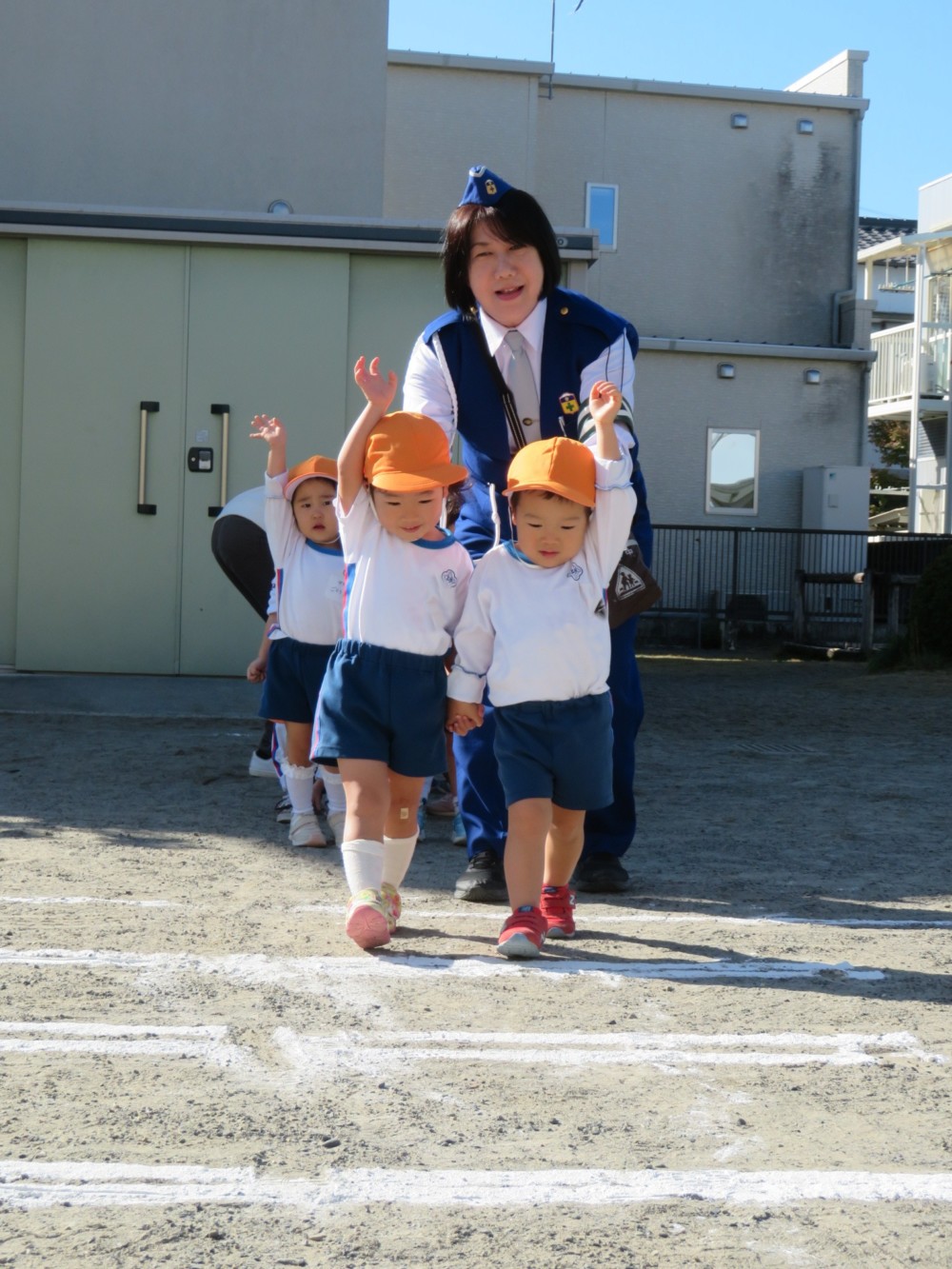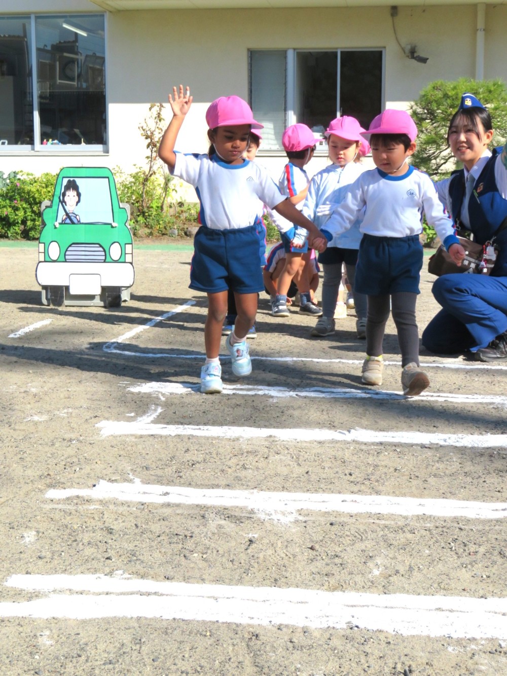本園では毎日歩いて集団降園しているので、交通ルールについてはどの子も大変関心があり、園庭での信号の渡り方の練習も、張り切って参加していました。