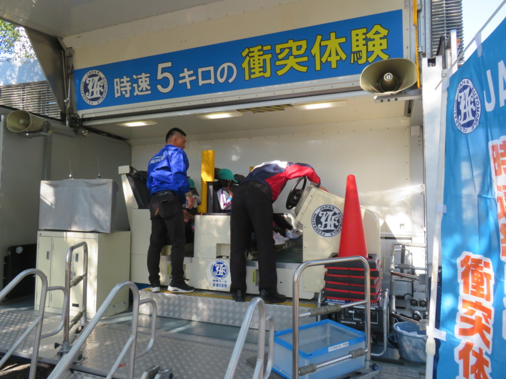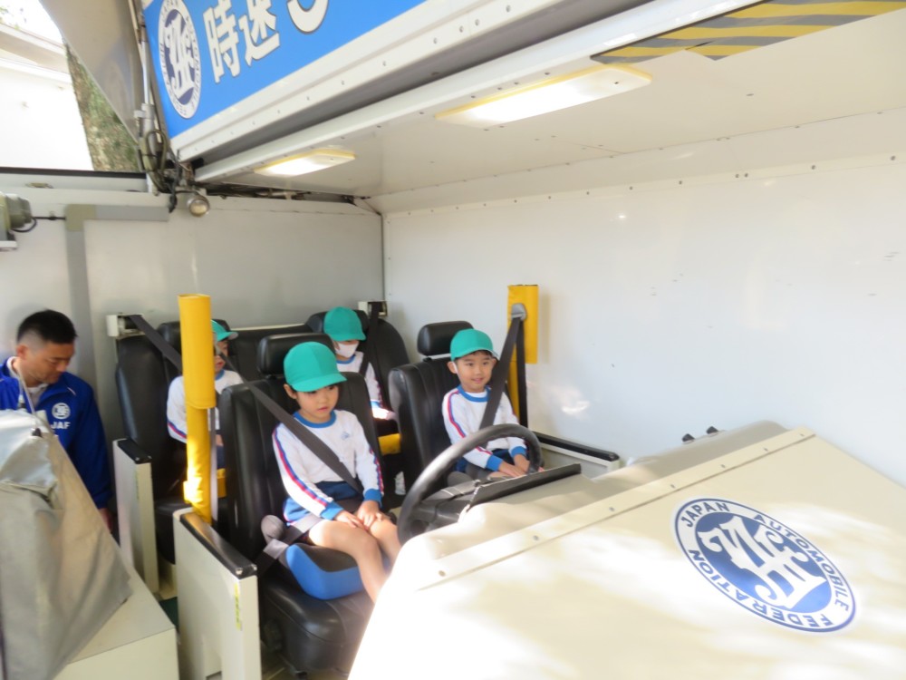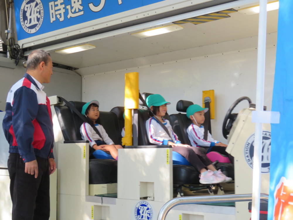 シートベルトをすることの大切さを話していただいた後に、時速5キロの衝突体験をしました。初めて体験した子どもたちは、みんなドキドキ!